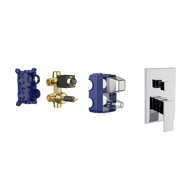 • The valve body and embedded housing: The brass body combined with the plastic embedded housing provides a stable structural support for easy installation and maintenance. Controls: Zinc alloy handles with Yizhan pressure-balancing valve cartridge and rotary selector valve ensure smooth adjustment and automatic hot and cold water balance.