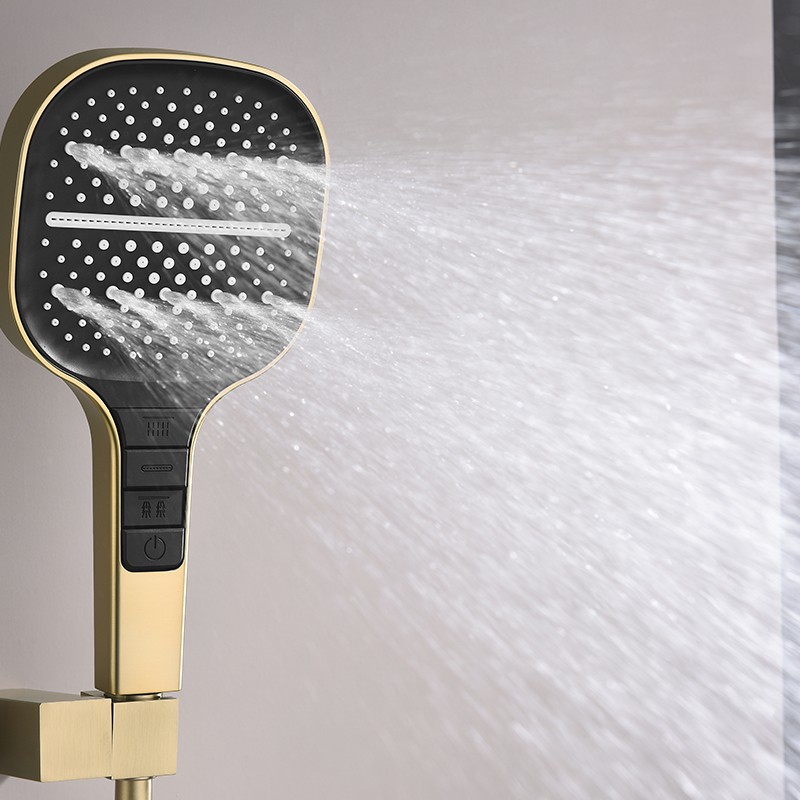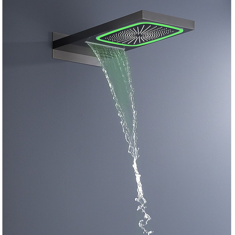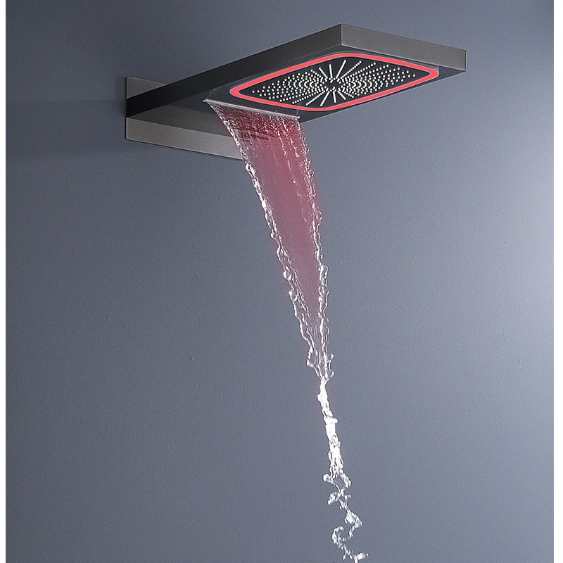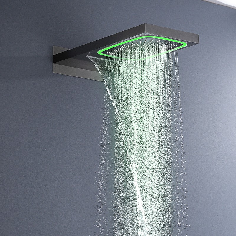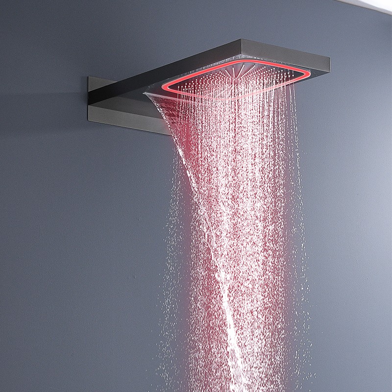 This four-function Black Concealed Shower features a solid brass recessed valve body and easily installs via an adjustable wall-mounted box. The advanced Vernet thermostatic valve cartridge maintains a constant water temperature, preventing sudden temperature fluctuations, while a NEOPERL push-button diverter allows for easy control of multiple water outlets. The Black Concealed Shower's 550 x 230 mm LED overhead shower offers both rain and waterfall modes and features a hydroelectrically powered color-changing light ring. The oxygen-enriched hand shower can be switched to rain, massage, or blended modes at the touch of a button, and features four body jets. Equipped with a flexible, tangle-free PVC hose and an adjustable brass wall-mount bracket, this concealed system combines practicality and aesthetics, creating a modern, spa-like shower space suitable for luxury homes, hotels, and wellness suites.