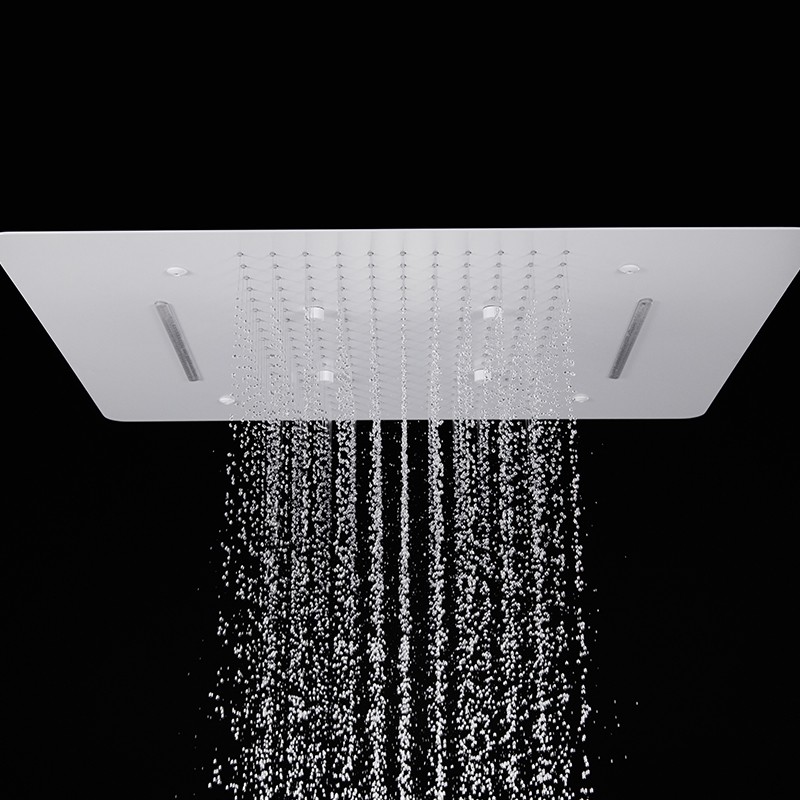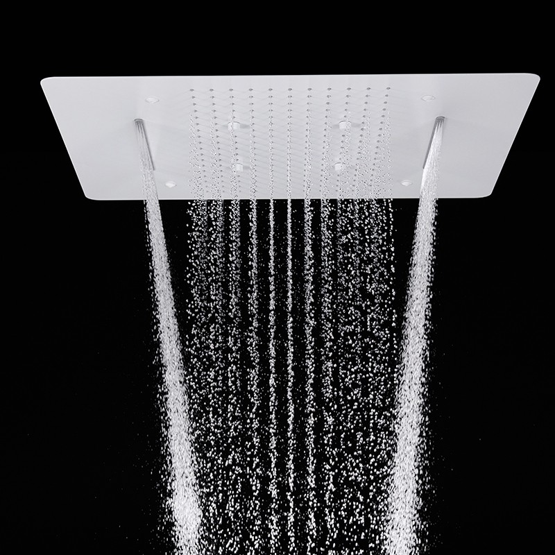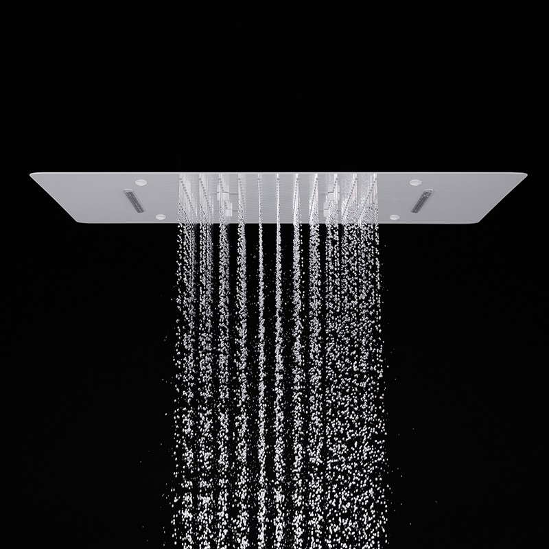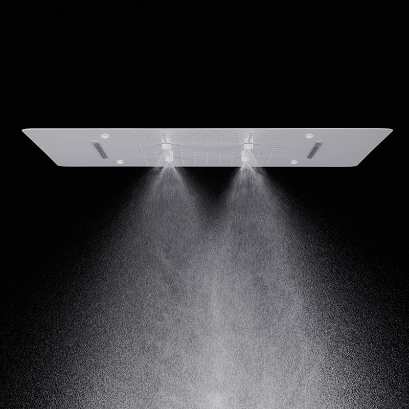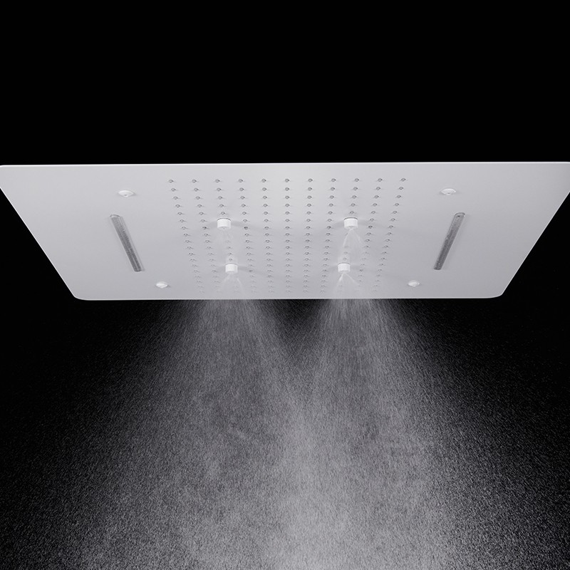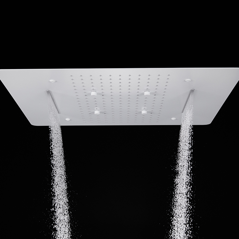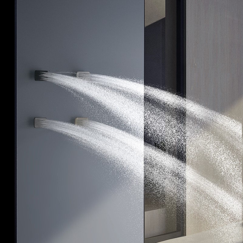 The Concealed Power Shower features a solid brass concealed valve body for durability and stability, and features an adjustable recessed cartridge. A Vernet thermostatic valve cartridge provides precise temperature control, and a NEOPERL push-button diverter allows for easy water outlet switching. The 590 x 480 mm ceiling shower head offers rain, waterfall, mist, and mixed spray modes. The 135 mm handheld showerhead is ergonomically designed and supports multiple spray patterns. Four body jets provide multi-directional hydromassage. The anti-twist PVC hose remains clean and flexible, and the 360 x 105 mm brass shelf provides practical storage for shower accessories.