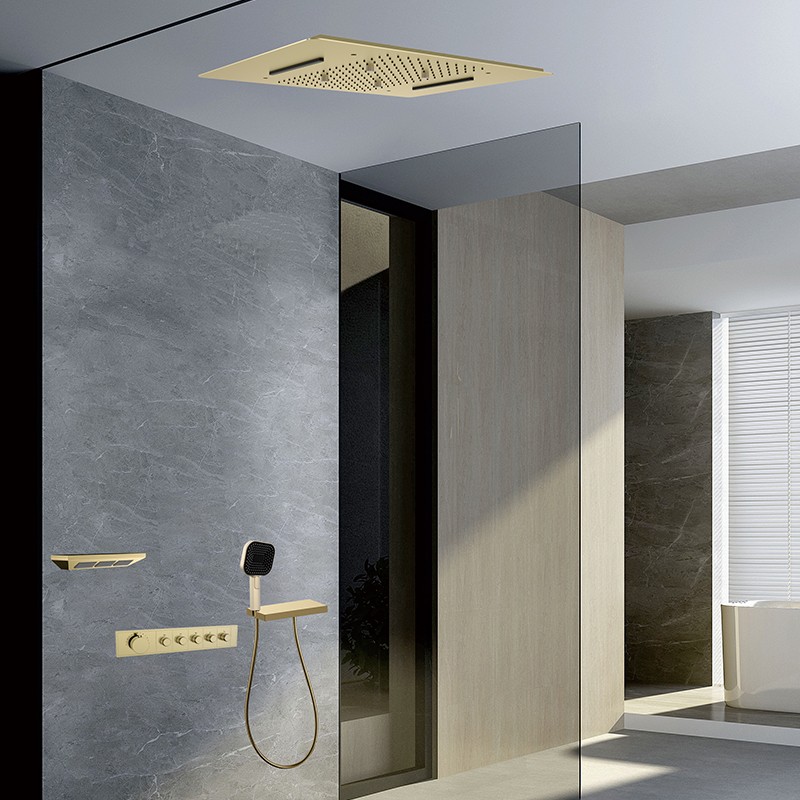 The Five-Function Constant Temperature Shower Set's concealed brass body ensures durability. The ultra-thin ceiling-mounted shower panel measures 590×480 mm, is a geometric rectangle with a smooth surface, and is available in a variety of finishes including chrome, matte black, gunmetal grey, and brushed gold. The square top shower head integrates multiple water modes and a sophisticated nozzle arrangement. The streamlined handheld showerhead and wall-mounted accessories complement each other. The overall design creates a simple yet refined spa atmosphere.