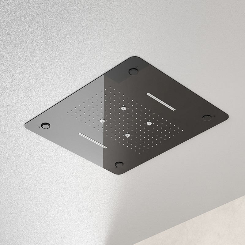 Equipped with a Vernet brand thermostatic cartridge, the system ensures precise temperature regulation, preventing sudden changes in water temperature. The anti-scald safety lock protects children and elderly users from accidental overheating.Multi-Mode Ceiling Shower